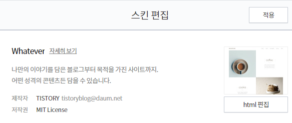 위 그림과 같이 스킨 편집으로 진입하여 html 편집으로